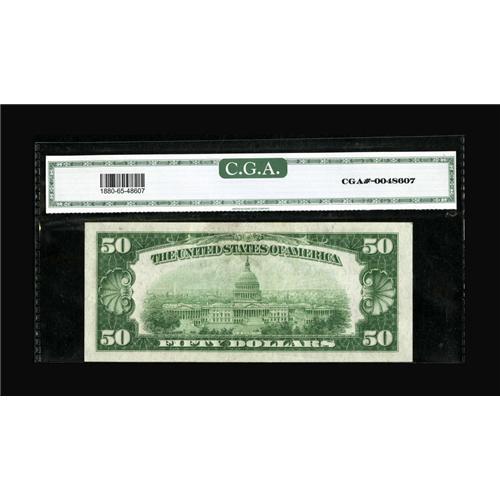 <B>Fr. 1880-B* $50 1929 Federal Reserve Bank Note. CGA Gem Uncirculated 65.</B></I><BR>Solid margins are met by bright white paper. Remnants of a teller's fingerprint are noted, but do little to detract from the overall eye appeal of the note.<BR><BR><b>Shipping:</b> Coins & Currency (<a target="_blank" href="http://www.heritageauctions.com/common/shipping.php">view shipping information</a>)