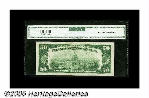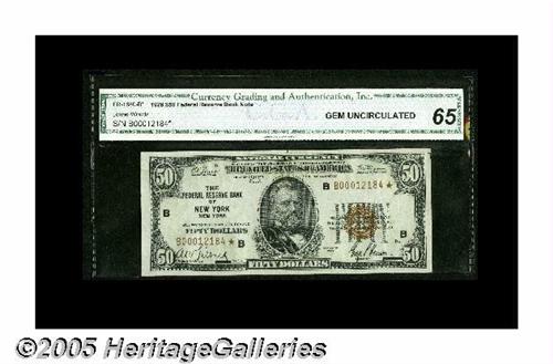 <B>Fr. 1880-B* $50 1929 Federal Reserve Bank Note. CGA Gem Uncirculated 65.</B></I><BR>A nicely centered high denomination star example which has been slabbed and graded Gem Uncirculated 65 by CGA. Although 50 star examples from this district are listed in the new Cybuski census, this piece is one of just four New York fifties recorded as CU in that listing.