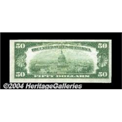Fr. 1880-B $50 1929 Federal Reserve Bank Note. Choice Crisp Uncirculated.A little minor handling and a couple of paper crimps are present but the paper originality is fabulous and the embossing is powerful throughout, giving this piece such incredible aesthetic merit that a grade less than Choice CU would not fairly classify this example. <BR><BR><B>Important notice:</B> Heritage usually auctions material at the rate of 200-250 lots per hour. On some occasions eBay Live bid software or the Internet may not be able to keep up with the pace of the auction. We recommend placing a realistic absentee bid now as insurance to avoid disappointment. Occasionally the auctioneer may eliminate or reject an eBay Live bid, and the auctioneer may also reopen a lot after the close of the eBay live bidding (usually because we missed an audience bid), and may reject your bid even if it shows you as the winning bidder. By bidding via eBay Live, you agree that Heritage may award the lot to another bidder at its sole discretion under the circumstances described above or any other reasonable circumstances. Since eBay bids are not shown to us until we open the lot on the floor, we treat those bids just like floor bids. In most cases the floor responds before the eBay bid is presented to us, due to Internet lag time, so for consistency we have made it a policy that floor bids are always considered first over tie eBay live bids. Also please note that all Heritage lots purchased through eBay Live carry a 20% Buyer's Premium. Please make sure you read the Terms and Conditions before you bid. <BR><BR><B>IMPORTANT ANNOUNCEMENT ABOUT RESERVES:</B> Heritage now divulges all reserves on its web site 7 days before every auction. If you want to know whether the reserve on this lot has been met, and if not, what the reserve amount is, please visit this lot page on the HeritageCoin.com web site, or email: bid@HeritageGalleries.com