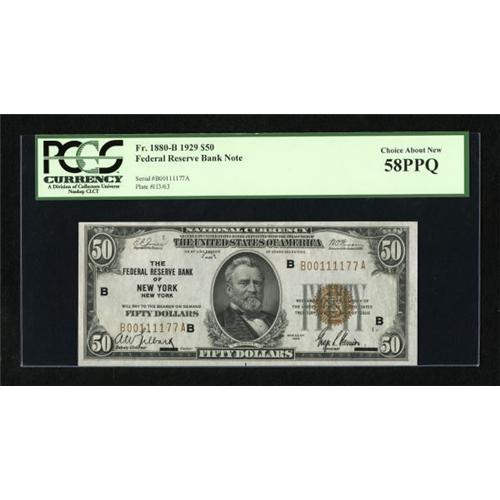 <B>Fr. 1880-B $50 1929 Federal Reserve Bank Note. PCGS Choice About New 58PPQ.</B></I><BR> A neat serial number is noticed on this bright Brown Seal.<BR><I>From The Thomas A. Bergin Collection</B></I><BR><BR><b>Shipping:</b> Coins & Currency (<a target="_blank" href="http://www.heritageauctions.com/common/shipping.php">view shipping information</a>)