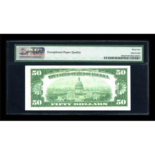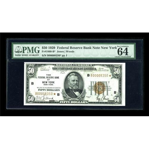 <B>Fr. 1880-B* $50 1929 Federal Reserve Bank Note. PMG Choice Uncirculated 64 EPQ.</B></I><BR> Gem sized margins are noted on this wholly original Star note. Examination of the back of the note reveals bold embossing of all of the overprinted details. Oakes' census indicates that this is one of only four uncirculated examples known.<BR><BR><b>Shipping:</b> Coins & Currency (<a target="_blank" href="http://www.heritageauctions.com/common/shipping.php">view shipping information</a>)
