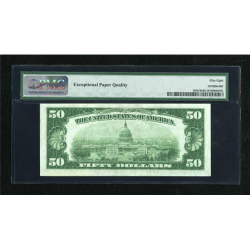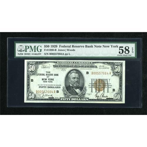<B>Fr. 1880-B $50 1929 Federal Reserve Bank Note. PMG Choice About Unc 58 EPQ.</B></I><BR> This $50 is broadly margined on bright paper.<BR><BR><b>Shipping:</b> Coins & Currency (<a target="_blank" href="http://www.heritageauctions.com/common/shipping.php">view shipping information</a>)