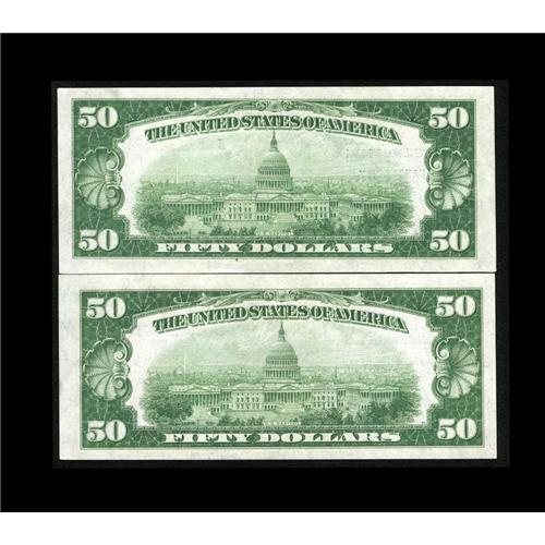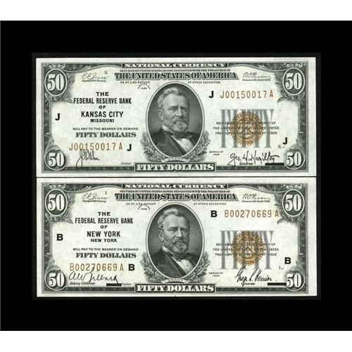 <B>Fr. 1880-B1880-J $50 1929 Federal Reserve Bank Notes. Choice Crisp Uncirculated, Crisp Uncirculated.</B></I><BR>Two pieces, the first with some handling, the second with a corner fold.
