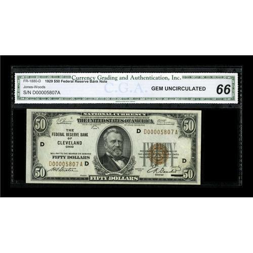 <B>Fr. 1880-D $50 1929 Federal Reserve Bank Note. CGA Gem Uncirculated 66.</B></I><BR>This four digit FRBN with serial number D00005807A is consecutive to the previous lot and virtually identical in appearance.<BR><BR><b>Shipping:</b> Coins & Currency (<a target="_blank" href="http://www.heritageauctions.com/common/shipping.php">view shipping information</a>)