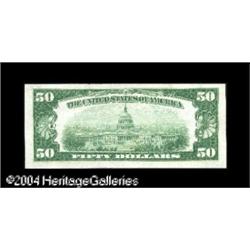 Fr. 1880-D $50 1929 Federal Reserve Bank Note. Gem Cris <B>Fr. 1880-D $50 1929 Federal Reserve Bank Note. Gem Crisp Uncirculated.</B></I><BR>A nicely centered and pack fresh example from a consecutive run we sold back in our May, 1998 sale. <BR><BR><B>Important notice:</B> Heritage usually auctions material at the rate of 200-250 lots per hour. On some occasions eBay Live bid software or the Internet may not be able to keep up with the pace of the auction. We recommend placing a realistic absentee bid now as insurance to avoid disappointment. Occasionally the auctioneer may eliminate or reject an eBay Live bid, and the auctioneer may also reopen a lot after the close of the eBay live bidding (usually because we missed an audience bid), and may reject your bid even if it shows you as the winning bidder. By bidding via eBay Live, you agree that Heritage may award the lot to another bidder at its sole discretion under the circumstances described above or any other reasonable circumstances. Since eBay bids are not shown to us until we open the lot on the floor, we treat those bids just like floor bids. In most cases the floor responds before the eBay bid is presented to us, due to Internet lag time, so for consistency we have made it a policy that floor bids are always considered first over tie eBay live bids. Also please note that all Heritage lots purchased through eBay Live carry a 20% Buyer's Premium. Please make sure you read the Terms and Conditions before you bid. This lot is being auctioned in conjunction with a live floor auction by Heritage Galleries & Auctioneers. All final auction and invoice information will be supplied by Heritage Galleries & Auctioneers, and all other information should be considered preliminary. Lot:16315
