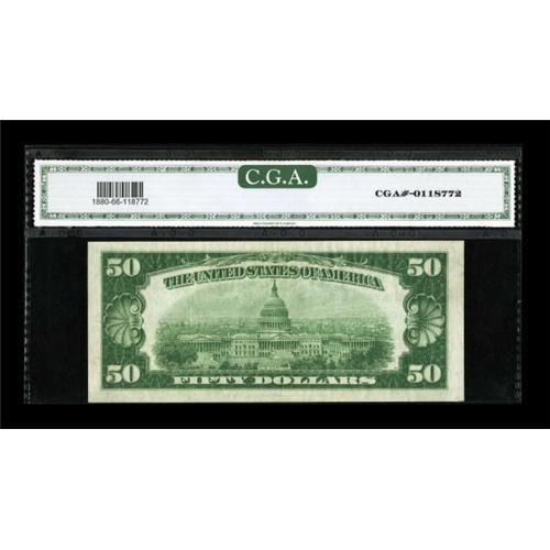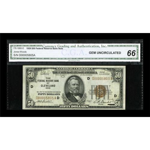 <B>Fr. 1880-D $50 1929 Federal Reserve Bank Note. CGA Gem Uncirculated 66.</B></I><BR> Broad margins and decent paper quality are noted on this Cleveland $50, though it is a touch tight along the bottom.<BR><BR><b>Shipping:</b> Coins & Currency (<a target="_blank" href="http://www.heritageauctions.com/common/shipping.php">view shipping information</a>)