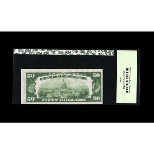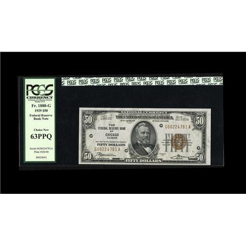 <B>Fr. 1880-G $50 1929 Federal Reserve Bank Note. PCGS Choice New 63PPQ.</B></I><BR>Natural paper wave and embossing are found on this $50 that is kept from a higher grade by a thin bottom margin.<BR><BR><b>Shipping:</b> Coin/Currency (<a target="_blank" href="http://www.heritageauctions.com/common/shipping.php">view shipping information</a>)