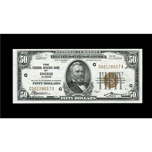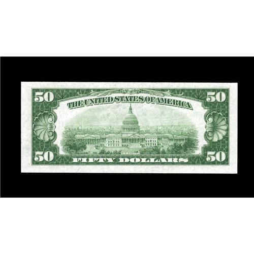 <B>Fr. 1880-G $50 1929 Federal Reserve Bank Note. Very Choice Crisp Uncirculated.</B></I><BR>While certainly ample, we would want a touch larger top margin to call this note Gem. Overall the paper is exceptional and the color pleasing.