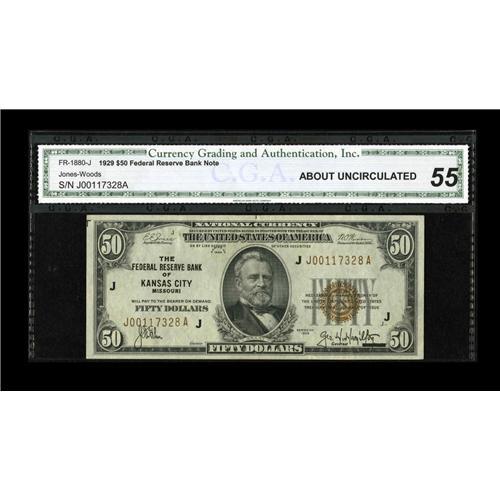 <B>Fr. 1880-J $50 1929 Federal Reserve Bank Note. CGA About Uncirculated 55.</B></I><BR>A center fold is found on this nicely margined KC $50.