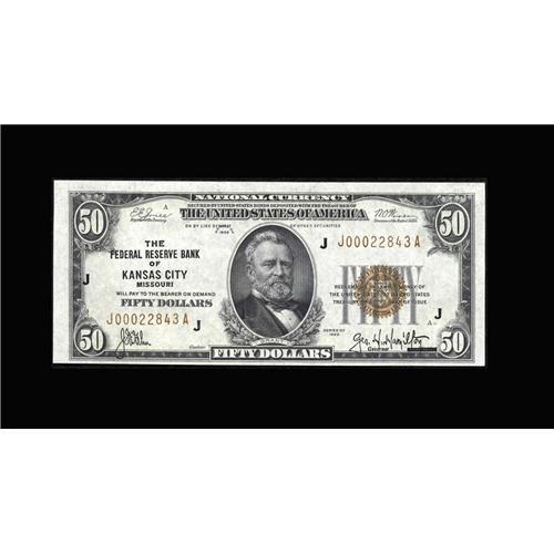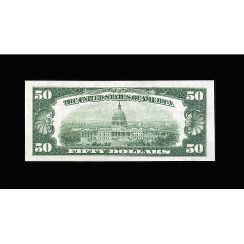 <B>Fr. 1880-J $50 1929 Federal Reserve Bank Note. Choice Crisp Uncirculated.</B></I> The final black portion of the over print is slightly skewed placing some elements into the design.