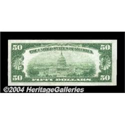 Fr. 1880-J $50 1929 Federal Reserve Bank Note. Gem Crisp Uncirculated.A fantastic, fully original Kansas City Fifty with gorgeous original paper wave and outstanding eye appeal. <BR><BR><B>Important notice:</B> Heritage usually auctions material at the rate of 200-250 lots per hour. On some occasions eBay Live bid software or the Internet may not be able to keep up with the pace of the auction. We recommend placing a realistic absentee bid now as insurance to avoid disappointment. Occasionally the auctioneer may eliminate or reject an eBay Live bid, and the auctioneer may also reopen a lot after the close of the eBay live bidding (usually because we missed an audience bid), and may reject your bid even if it shows you as the winning bidder. By bidding via eBay Live, you agree that Heritage may award the lot to another bidder at its sole discretion under the circumstances described above or any other reasonable circumstances. Since eBay bids are not shown to us until we open the lot on the floor, we treat those bids just like floor bids. In most cases the floor responds before the eBay bid is presented to us, due to Internet lag time, so for consistency we have made it a policy that floor bids are always considered first over tie eBay live bids. Also please note that all Heritage lots purchased through eBay Live carry a 20% Buyer's Premium. Please make sure you read the Terms and Conditions before you bid. <BR><BR><B>IMPORTANT ANNOUNCEMENT ABOUT RESERVES:</B> Heritage now divulges all reserves on its web site 7 days before every auction. If you want to know whether the reserve on this lot has been met, and if not, what the reserve amount is, please visit this lot page on the HeritageCoin.com web site, or email: bid@HeritageGalleries.com