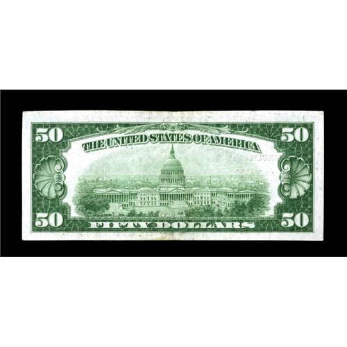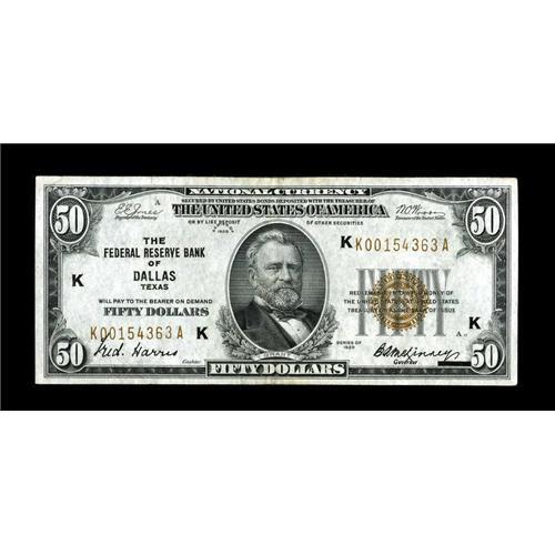 <B>Fr. 1880-K $50 1929 Federal Reserve Bank Note. About Uncirculated.</B></I><BR>Soft surfaces are noted on this bright and pleasing $50 that has a light center fold. Our lucky consignor put together his set of Dallas FRBN's by acquiring them through his bank over ten years ago, but, don't let his teller know.<BR><BR><b>Shipping:</b> Coins & Currency (<a target="_blank" href="http://www.heritageauctions.com/common/shipping.php">view shipping information</a>)