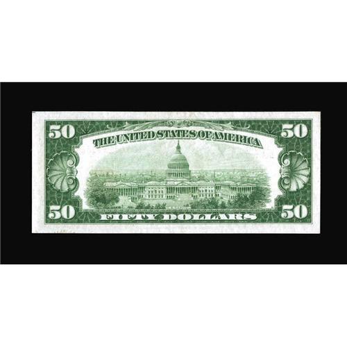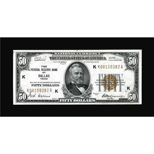 <B>Fr. 1880-K $50 1929 Federal Reserve Bank Note. Choice About Uncirculated.</B></I><BR>The $50 and $100 Dallas FRBN's are the keys to their respective series. This attractive piece has a light horizontal bend that precludes a Gem grade. The paper is bright and the margins sizeable.<BR><BR><b>Shipping:</b> Coins & Currency (<a target="_blank" href="http://www.heritageauctions.com/common/shipping.php">view shipping information</a>)