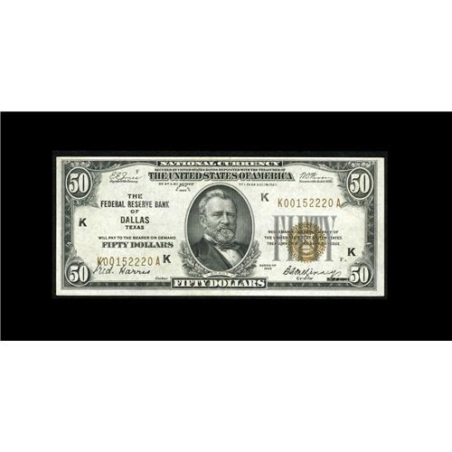 <B>Fr. 1880-K $50 1929 Federal Reserve Bank Note. Extremely Fine.</B></I><BR>Only 168,000 Dallas Fifties were printed, so how many have now been destroyed upon their return to the Fed?