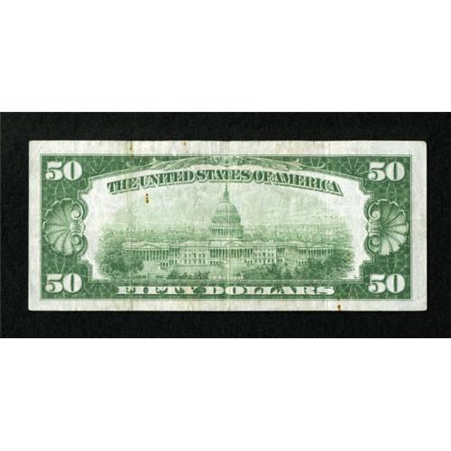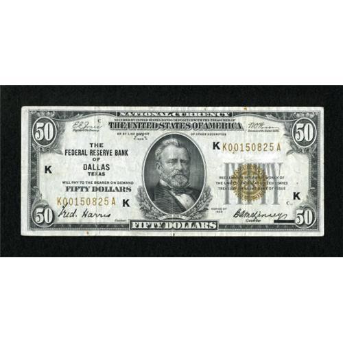 <B>Fr. 1880-K $50 1929 Federal Reserve Bank Note. Very Fine.</B></I><BR> The Dallas district is the toughest of the seven Fed branches that issued $50 FRBNs. This piece has a few age spots with most of them on the back.<BR><BR><b>Shipping:</b> Coins & Currency (<a target="_blank" href="http://www.heritageauctions.com/common/shipping.php">view shipping information</a>)