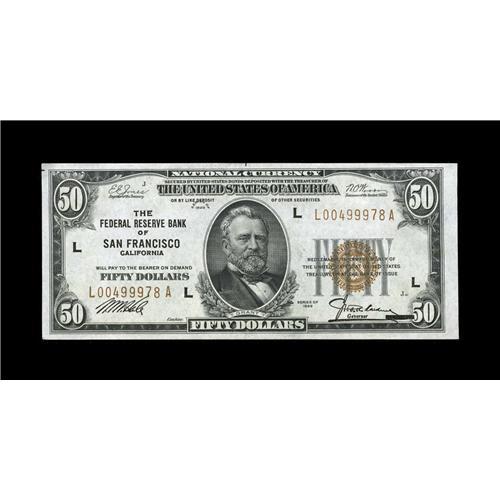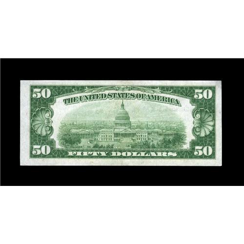 <B>Fr. 1880-L $50 1929 Federal Reserve Bank Note. Crisp Uncirculated.</B></I><BR>Another bright example one away from the previous note. This one has a corner tip fold which affects nothing