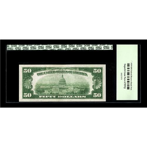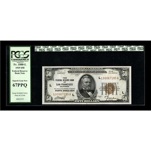 <B>Fr. 1880-L $50 1929 Federal Reserve Bank Note. PCGS Superb Gem New 67PPQ.</B></I><BR>Unquestionably the finest example of this scarce San Francisco FRBN that we have offered in the past several years. Four boardwalk margins are accompanied by cavernous embossing and perfect centering. With Choice CU examples realizing several hundred dollars we would not be surprised to see this lovely note surpass the four figure price range.<BR><BR><b>Shipping:</b> Coin/Currency (<a target="_blank" href="http://www.heritageauctions.com/common/shipping.php">view shipping information</a>)