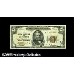 <B>Fr. 1880-L* $50 1929 Federal Reserve Bank Note. Very Fine+.</B></I><BR>Another great rarity from the Taylor Family collection, with this the nicest of the three recorded San Francisco $50 stars. The Oakes example (offered when the star census from here was just two notes) realized over $12,000, and, although another specimen has now surfaced, this is still a major rarity worthy of the finest of collections. It's an entirely unmolested piece with no flaws whatever, and one which is certain to delight its fortunate new owner. Lot:15782