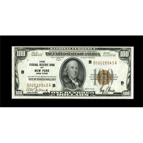 <B>Fr. 1890-B $100 1929 Federal Reserve Bank Note. Choice Crisp Uncirculated.</B></I><BR> This is another wholly original note that just misses being Gem due to a tight top margin.<BR><I>From The J.S. Weber Collection.</B></I><BR><BR><b>Shipping:</b> Coins & Currency (<a target="_blank" href="http://www.heritageauctions.com/common/shipping.php">view shipping information</a>)
