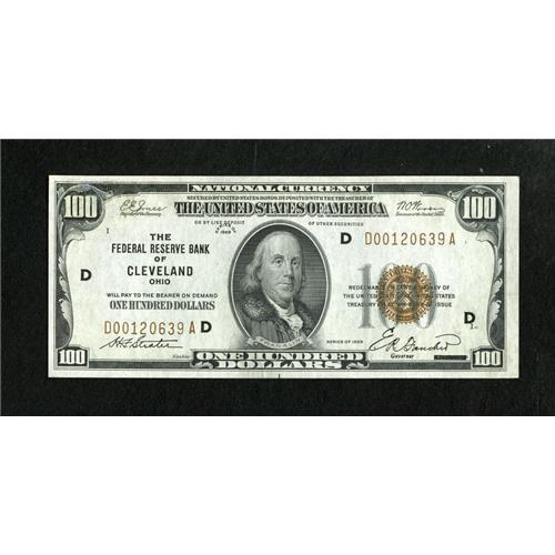 <B>Fr. 1890-D $100 1929 Federal Reserve Bank Note. Choice About Uncirculated.</B></I><BR>This piece is pleasing in appearance and separated from Gem by a lone centerfold and some light handling. The paper is well embossed though there is a stain covered up in the upper left corner.<BR><BR><b>Shipping:</b> Coins & Currency (<a target="_blank" href="http://www.heritageauctions.com/common/shipping.php">view shipping information</a>)