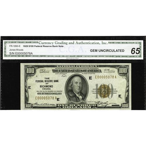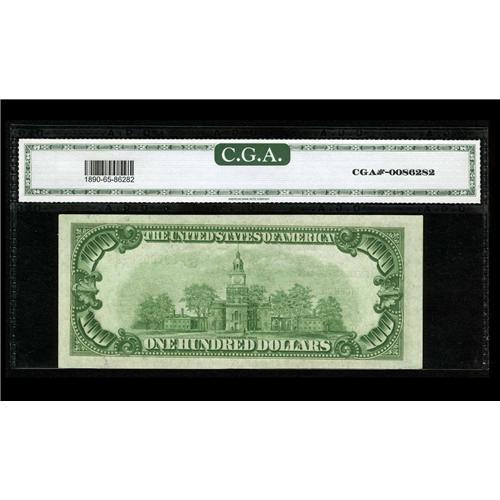 <B>Fr. 1890-E $100 1929 Federal Reserve Bank Note. CGA Gem Uncirculated 65.</B></I><BR>Embossing is seen through the third-party holder on this nicely margined four-digit example.