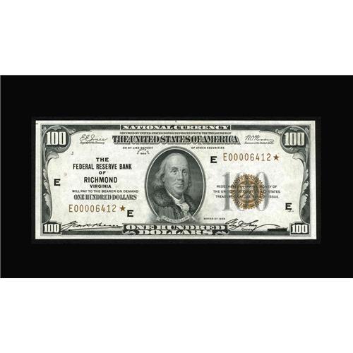 <B>Fr. 1890-E* $100 1929 Federal Reserve Bank Note. Crisp Uncirculated.</B></I><BR>Unquestionably the finest of the five verified examples listed in the new Cybuski study, with this piece formerly part of the Dr. Lawrence Cookson Federal Reserve Bank Note Collection. This lovely note is bright and well centered, and displays exceptionally vivid colors as well. There are a couple of closed pinholes, which are virtually impossible to locate with the naked eye, but the overall appearance of the piece is absolutely exemplary. Expect to see bidding easily reach and likely exceed our conservative estimate of...
