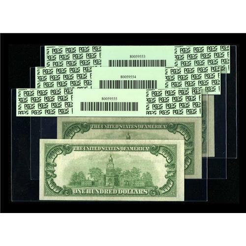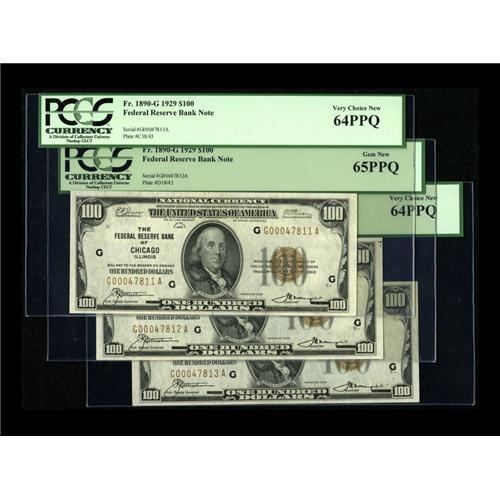 <B>Fr. 1890-G $100 1929 Federal Reserve Bank Notes. Three Consecutive Examples (2) PCGS Very Choice New 64PPQ (1) Gem New 65PPQ</B></I><BR>This is simply a marvelous trio of original brown seals off the Chicago district. The colors are quite vivid and the embossing pronounced.<BR><BR><b>Shipping:</b> Coins & Currency (<a target="_blank" href="http://www.heritageauctions.com/common/shipping.php">view shipping information</a>)