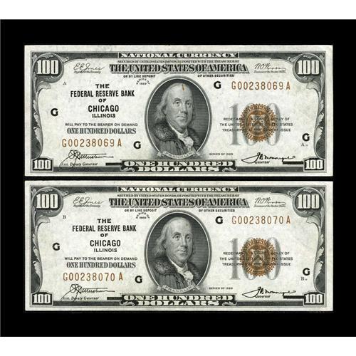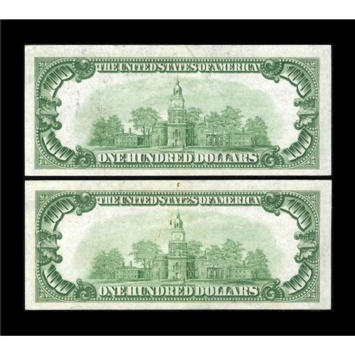 <B>Fr. 1890-G $100 1929 Federal Reserve Bank Notes. Two Consecutive Examples. About Uncirculated.</B></I><BR>Both of these embossed notes have a center fold and a very little bit of staining at top center. The first note has it more on the face, while the second note has it more on the back.<BR><BR><b>Shipping:</b> Coins & Currency (<a target="_blank" href="http://www.heritageauctions.com/common/shipping.php">view shipping information</a>)