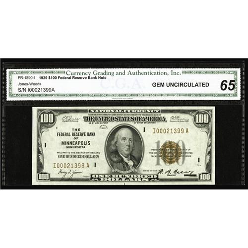 <B>Fr. 1890-I $100 1929 Federal Reserve Bank Note. CGA Gem Uncirculated 65.</B></I><BR>Our first offering this evening of a scarcer Minneapolis C-Note that had a print run of 144,000 notes.