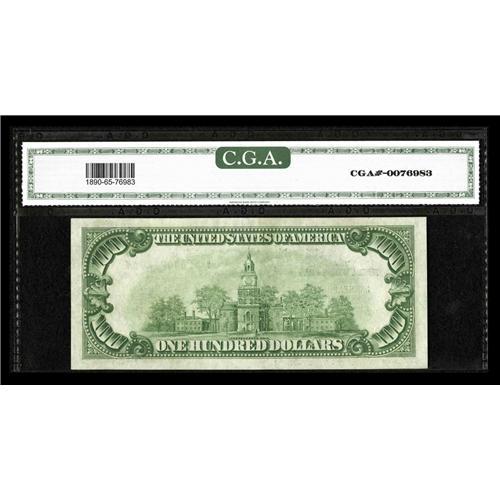 <B>Fr. 1890-I $100 1929 Federal Reserve Bank Note. CGA Gem Uncirculated 65.</B></I><BR>A wonderful gem example from an uncommonly encountered district of which this is our second tonight. The paper is bright with bold brown ink colors and a great deal of pizzazz. New notes for this series are few and far between.