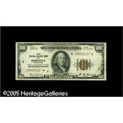 <B>Fr. 1890-I* $100 1929 Federal Reserve Bank Note. Fine-Very Fine.</B></I><BR>One of the great rarities in this collection, as this is one of just two recorded $100 star examples from the Minneapolis district. It was last offered in the Oakes collection, where it realized a strong $14,950 after a bidding war between two determined combatants. It's just as rare today as it was in November of 2003, but the number of buyers has diminished by one. What difference that will make, if any, in this note's realization in this offering will be determined tonight. Lot:15790
