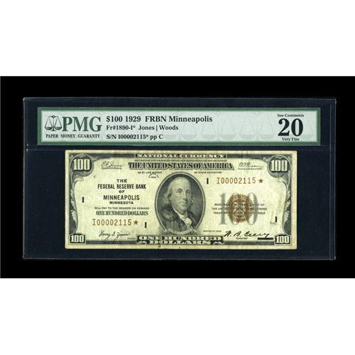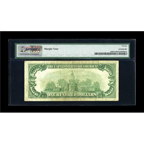 <B>Fr. 1890-I* $100 1929 Federal Reserve Bank Note. PMG Very Fine 20.</B></I><BR>This is a newly discovered piece and it increases the census of this rare Friedberg number up to a mere three. In February 2005 we sold the Taylor Family Collection example that is a full grade lower for almost $11,000. The PMG label states "Margin Tear." We see the tear and it barely penetrates the bottom frame line. Though we have had two in the last two years of this number, when will another opportunity arise?<BR><BR><b>Shipping:</b> Coins & Currency (<a target="_blank" href="http://www.heritageauctions.com/common/shipping.php">view shipping information</a>)