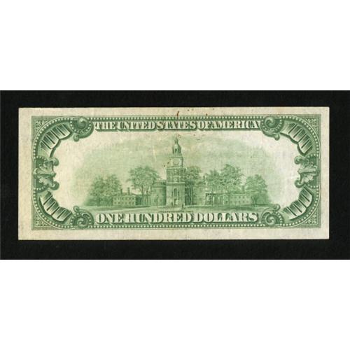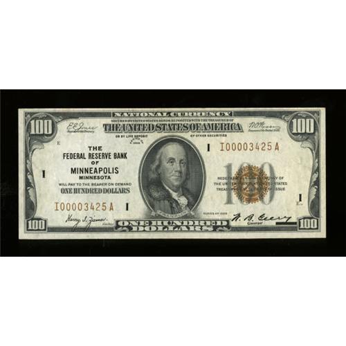 <B>Fr. 1890-I $100 1929 Federal Reserve Bank Note. Extremely Fine-About Uncirculated.</B></I><BR> This Minneapolis $100 has serial number 3425. We can recall only a few three-digit serial numbers over the years for this district and denomination. This example has a center fold and a little more handling plus some rust specks on the back.<BR><BR><b>Shipping:</b> Coins & Currency (<a target="_blank" href="http://www.heritageauctions.com/common/shipping.php">view shipping information</a>)