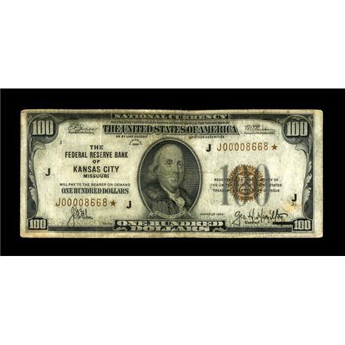 <B>Fr. 1890-J* $100 1929 Federal Reserve Bank Note. Fine.</B></I><BR>We average about one of this Friedberg number every two years, making it the most available $100 FRBN star and perfect for a type collection. This example spent time as a wallet piece, yet the edges are better than normally found on similarly housed pieces.<BR><BR><b>Shipping:</b> Coins & Currency (<a target="_blank" href="http://www.heritageauctions.com/common/shipping.php">view shipping information</a>)