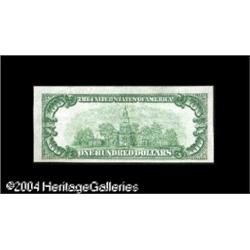 Fr. 1890-J $100 1929 Federal Reserve Bank Note. Very Fi <B>Fr. 1890-J $100 1929 Federal Reserve Bank Note. Choice Crisp Uncirculated.</B></I><BR>A fresh note that is a Gem in all respects but for the tight bottom margin. <BR><BR><B>Important notice:</B> Heritage usually auctions material at the rate of 200-250 lots per hour. On some occasions eBay Live bid software or the Internet may not be able to keep up with the pace of the auction. We recommend placing a realistic absentee bid now as insurance to avoid disappointment. Occasionally the auctioneer may eliminate or reject an eBay Live bid, and the auctioneer may also reopen a lot after the close of the eBay live bidding (usually because we missed an audience bid), and may reject your bid even if it shows you as the winning bidder. By bidding via eBay Live, you agree that Heritage may award the lot to another bidder at its sole discretion under the circumstances described above or any other reasonable circumstances. Since eBay bids are not shown to us until we open the lot on the floor, we treat those bids just like floor bids. In most cases the floor responds before the eBay bid is presented to us, due to Internet lag time, so for consistency we have made it a policy that floor bids are always considered first over tie eBay live bids. Also please note that all Heritage lots purchased through eBay Live carry a 20% Buyer's Premium. Please make sure you read the Terms and Conditions before you bid. This lot is being auctioned in conjunction with a live floor auction by Heritage Galleries & Auctioneers. All final auction and invoice information will be supplied by Heritage Galleries & Auctioneers, and all other information should be considered preliminary. Lot:16323