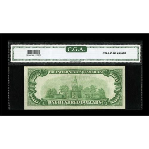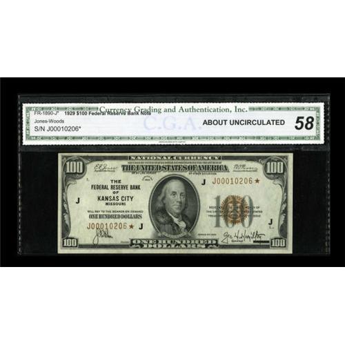 <B>Fr. 1890-J* $100 1929 Federal Reserve Bank Note. CGA About Uncirculated 58.</B></I><BR> A light center fold is the only handling this desirable Kansas City replacement has sustained.<BR><BR><b>Shipping:</b> Coins & Currency (<a target="_blank" href="http://www.heritageauctions.com/common/shipping.php">view shipping information</a>)