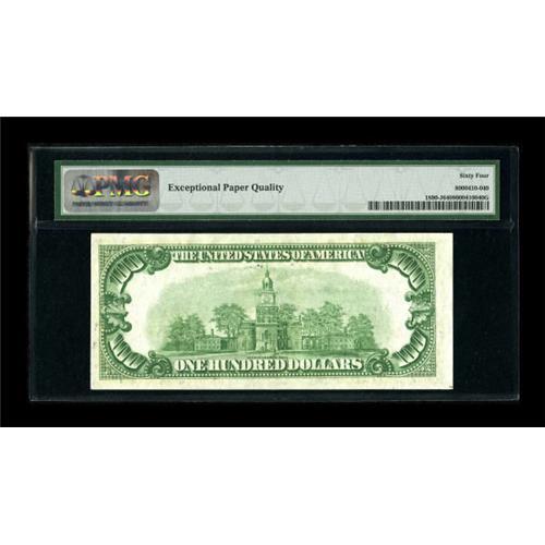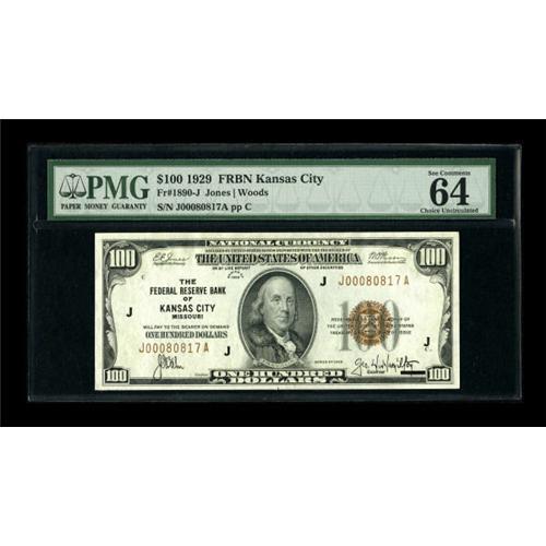 <B>Fr. 1890-J $100 1929 Federal Reserve Bank Note. PMG Choice Uncirculated 64 EPQ.</B></I><BR> An attractive issue with solid margins and bold embossing of the serial numbers and seal.<BR><BR><b>Shipping:</b> Coins & Currency (<a target="_blank" href="http://www.heritageauctions.com/common/shipping.php">view shipping information</a>)