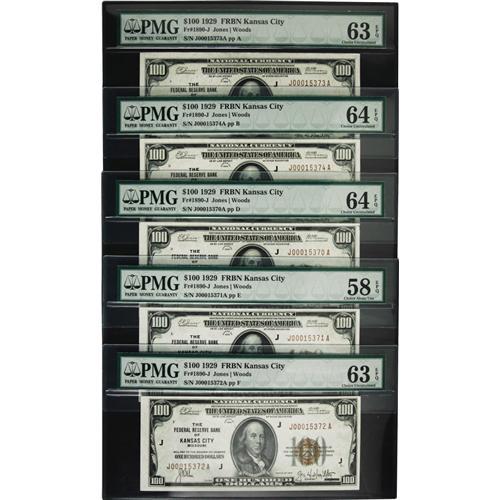 <B>Fr. 1890-J $100 1929 Federal Reserve Bank Notes. Five Consecutive Examples PMG Choice Uncirculated 64 EPQ (2), 63 EPQ (2), Choice About Unc 58 EPQ.</B></I><BR> Four choice examples are noticed in this group with the second note in the run exhibiting a touch too much handling for the new designation. No longer seen in runs like this, so expect a realization in the area of...<BR><BR><b>Shipping:</b> Coins & Currency (<a target="_blank" href="http://www.heritageauctions.com/common/shipping.php">view shipping information</a>)