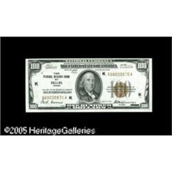 <B>Fr. 1890-K $100 1929 Federal Reserve Bank Note. Choice Crisp Uncirculated.</B></I><BR>Another piece from the Wallace hoard. Despite the existence of that group, this is easily the toughest district to obtain in this denomination, as the Dallas district had a printing of only 36,000 pieces. The centering is more than acceptable, although not quite as nice as on the example above. Lot:15793