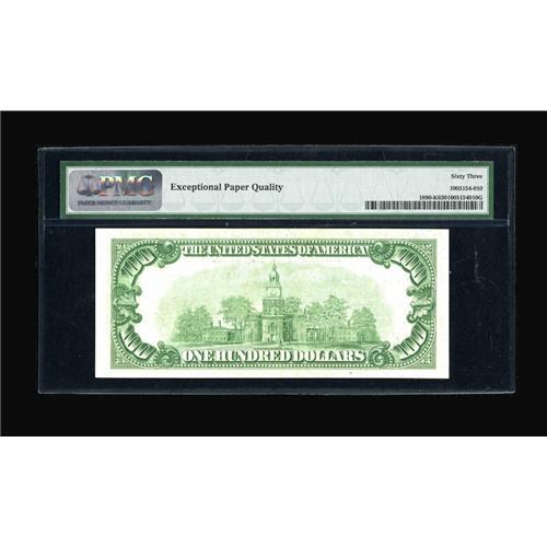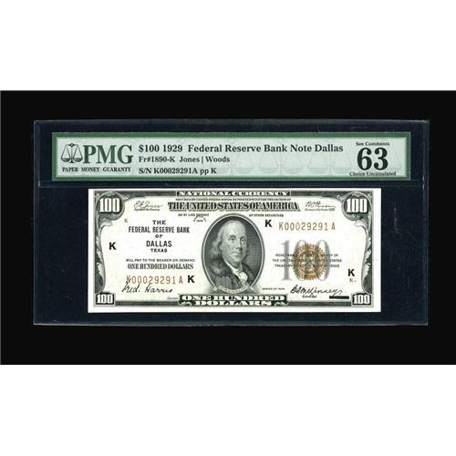 <B>Fr. 1890-K $100 1929 Federal Reserve Bank Note. PMG Choice Uncirculated 63 EPQ.</B></I><BR>A slim, but sufficient top margin prevented a full Gem grade for this attractive and obviously original C-note. According to our archives, two years have passed since we last offered an example of this key in Uncirculated condition or better. We expect the Oakes premium may be conservative given the drought of quality pieces.<BR><BR><b>Shipping:</b> Coins & Currency (<a target="_blank" href="http://www.heritageauctions.com/common/shipping.php">view shipping information</a>)