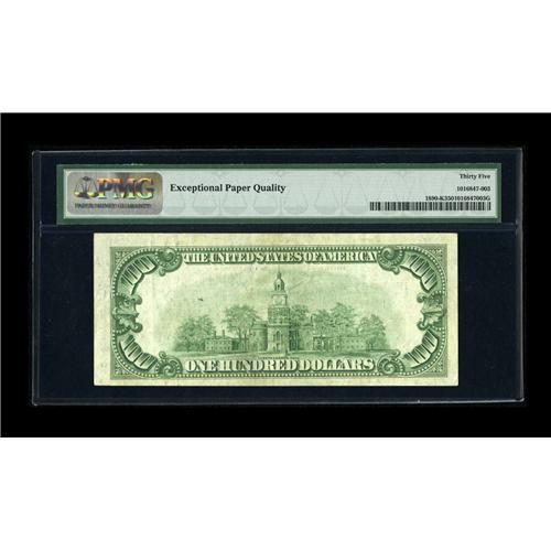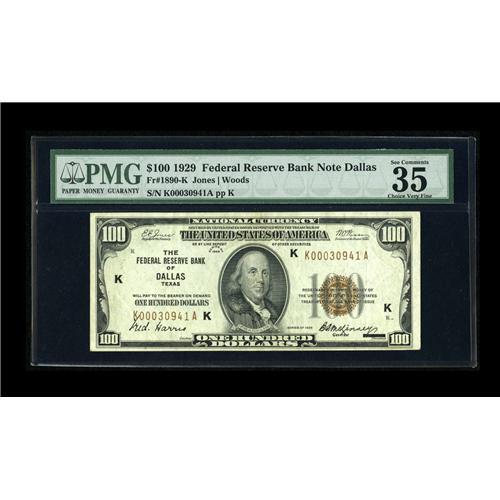 <B>Fr. 1890-K $100 1929 Federal Reserve Bank Note. PMG Very Fine 35 EPQ.</B></I><BR>The Dallas District issued only 36,000 1929 $100 FRBN's. The paper quality is premium as indicated by PMG. There is nary a hint of soiling and the embossing is still present.<BR><BR><b>Shipping:</b> Coin/Currency (<a target="_blank" href="http://www.heritageauctions.com/common/shipping.php">view shipping information</a>)