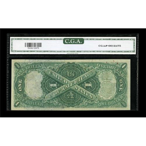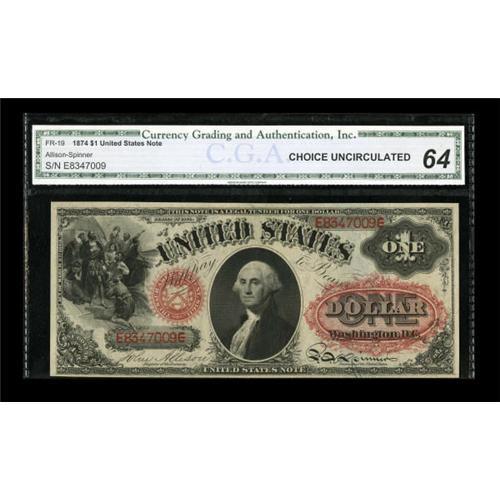 <B>Fr. 19 $1 1874 Legal Tender CGA Choice Uncirculated 64.</B></I> This near-Gem has been off the market since 2000. It comes from a run of known CU's. The overprint is deeply printed and the margins sufficient for a full Gem grade.<BR><BR><b>Shipping:</b> Coins & Currency (<a target="_blank" href="http://www.heritageauctions.com/common/shipping.php">view shipping information</a>)