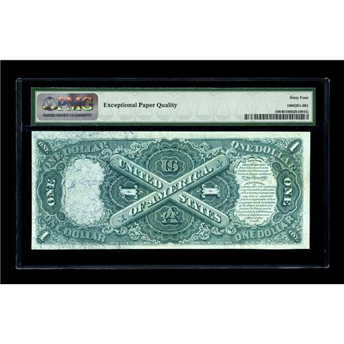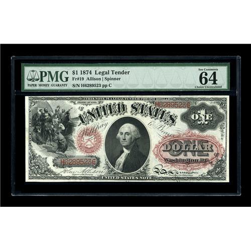 <B>Fr. 19 $1 1874 Legal Tender PMG Choice Uncirculated 64 EPQ.</B></I> From a small run of new examples. This note would have benefited from a little larger top margin. Very flashy with bold crimson overprints.<BR><BR><b>Shipping:</b> Coin/Currency (<a target="_blank" href="http://www.heritageauctions.com/common/shipping.php">view shipping information</a>)