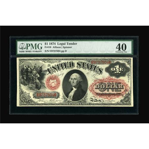 <B>Fr. 19 $1 1874 Legal Tender PMG Extremely Fine 40.</B></I> The red overprints are quite vibrant on this early ace.<B><BR></B></I><I>From The John Ameen Collection</B></I><BR><BR><b>Shipping:</b> Coins & Currency (<a target="_blank" href="http://www.heritageauctions.com/common/shipping.php">view shipping information</a>)