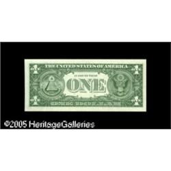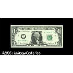 <B>Fr. 1900-B $1 1963 Federal Reserve Note. Gem Crisp Uncirculated.</B></I><BR>This 49/50 mismatch is found on an ideally centered example with wide even margins and flawless paper surfaces. Lot:15196