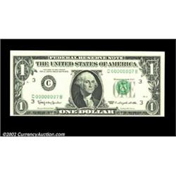 Fr. 1900-C $1 1963 Federal Reserve Note. About Uncirculated.Single digit serial number C00000007B. Important notice: We expect to be auctioning lots at the rate of 200-250 per hour. Sometimes eBay Premier live bid software cannot keep up with that pace, so we strongly recommend that you place a realistic proxy bid now as insurance to avoid disappointment. Also please note that all Heritage/CAA lots purchased through eBay Premier carry a 20% Buyer's Premium. Please make sure you read the Terms and Conditions.