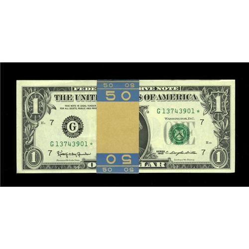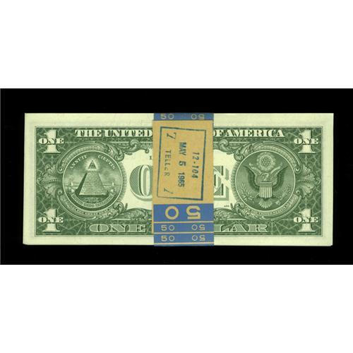 <B>Fr. 1900-G* $1 1963 Federal Reserve Notes. Pack of 50 Examples Choice Crisp Uncirculated.</B></I><BR>This pack which comes with a band dated May 5, 1965 contains two different runs of consecutive notes. The first run of about 18 notes exhibits a teller counting mark while the others are perfect.<BR><BR><b>Shipping:</b> Coins & Currency (<a target="_blank" href="http://www.heritageauctions.com/common/shipping.php">view shipping information</a>)