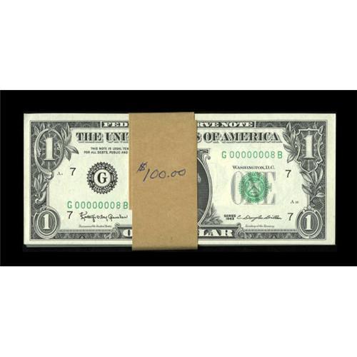 <B>Fr. 1900-G $1 1963 Federal Reserve Notes. Partial Pack Serial Number G00000008B-G00000100B. Very Choice Crisp Uncirculated.</B></I><BR> Ninety-three notes are found in this pack from the G-B block which starts at serial number G00000008B and ends with serial number G00000100B. Truly a wonderful pack with very fancy numbers. <BR><BR><b>Shipping:</b> Coins & Currency (<a target="_blank" href="http://www.heritageauctions.com/common/shipping.php">view shipping information</a>)