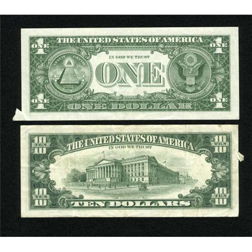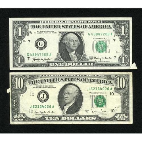 <B>Fr. 1901-G $1 1963A Federal Reserve Note. Extremely Fine-About Uncirculated.<BR>Fr. 2024-J $10 1977A Federal Reserve Note. Very Fine-Extremely Fine.</B></I><BR> A pleasing pair of attached tabs, one caused by a cutting error, the other caused by a tear.<BR><BR><b>Shipping:</b> Coins & Currency (<a target="_blank" href="http://www.heritageauctions.com/common/shipping.php">view shipping information</a>)