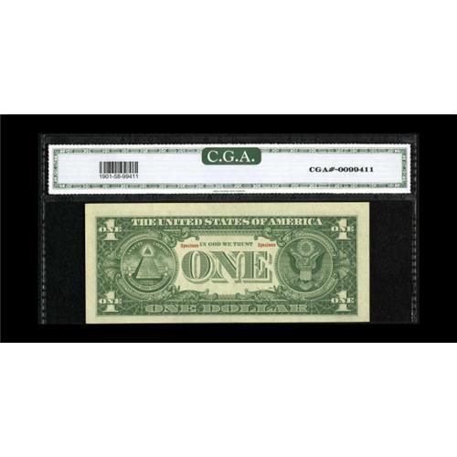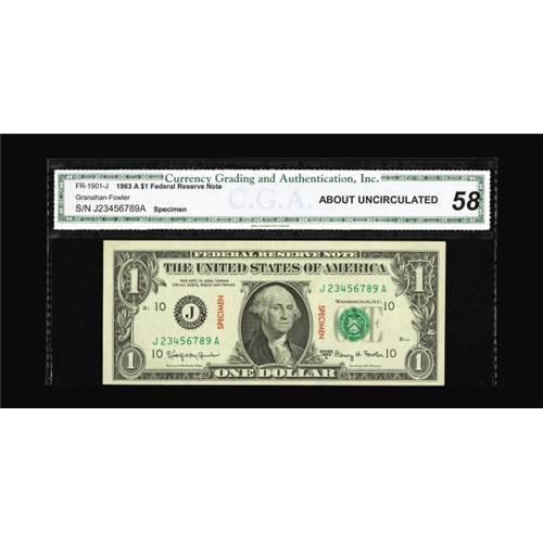 <B>Fr. 1901-J $1 Specimen 1963A Federal Reserve Note. CGA About Uncirculated 58.</B></I><BR>The word SPECIMEN is stamped twice vertically on either side of the portrait and again horizontally on either side of the motto IN GOD WE TRUST. The BEP would occasionally use ladder serial numbers to signify Specimens. This note features the eight digit J23456789A serial number.<BR>